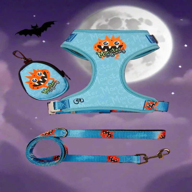 Luxury 3 Pieces Set: Monster is Coming: Luxury Fashion Harness ; Cute Leash and Poop bag (blue colour)